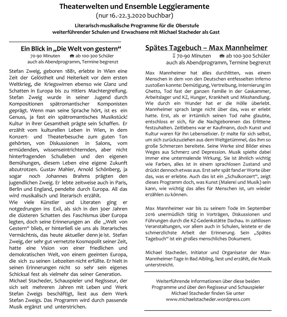 Wir verweisen gern für noch mehr Informationen auf Michael Stacheders Theaterwelten und zu seinen eigenen Artikeln über die Stimmen aus der Welt von Gestern und Spätes Tagebuch.